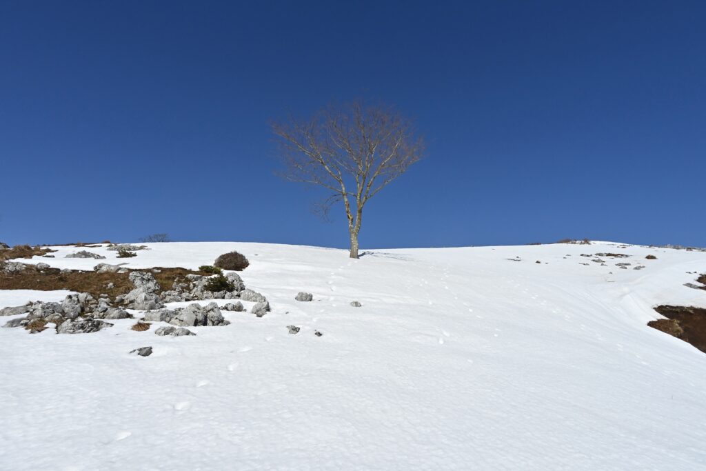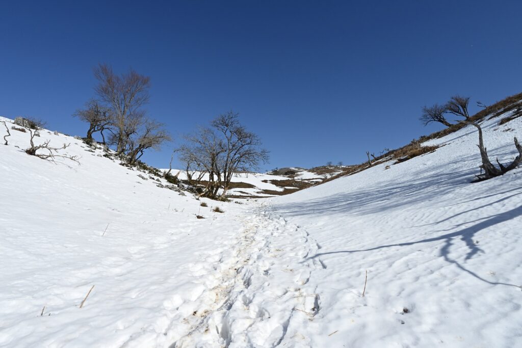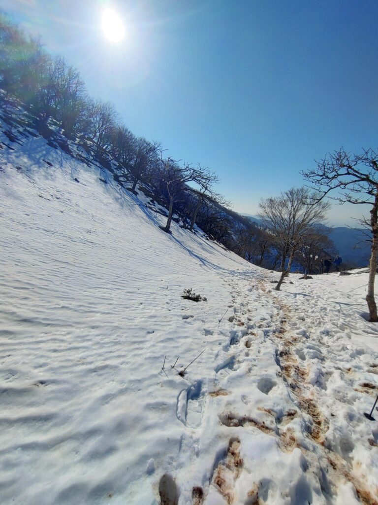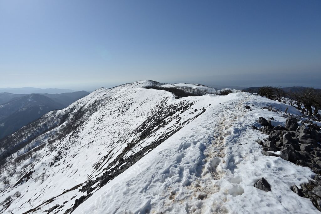 今年はこれまでのところ、冬型の気圧配置が長続きせず雪が降ってもすぐに溶けてしまう状況で霊仙山も、あまり雪がないとの情報だったので景色だけも楽しめたらと考えて行ってみたのですが、山頂付近の雪はしっかり残っていて存分にスノートレッキングを楽しむことができました。また琵琶湖や伊吹山を望む景色も最高で1,000mちょっとの山とは思えないくらい素晴らしい登山ができました。