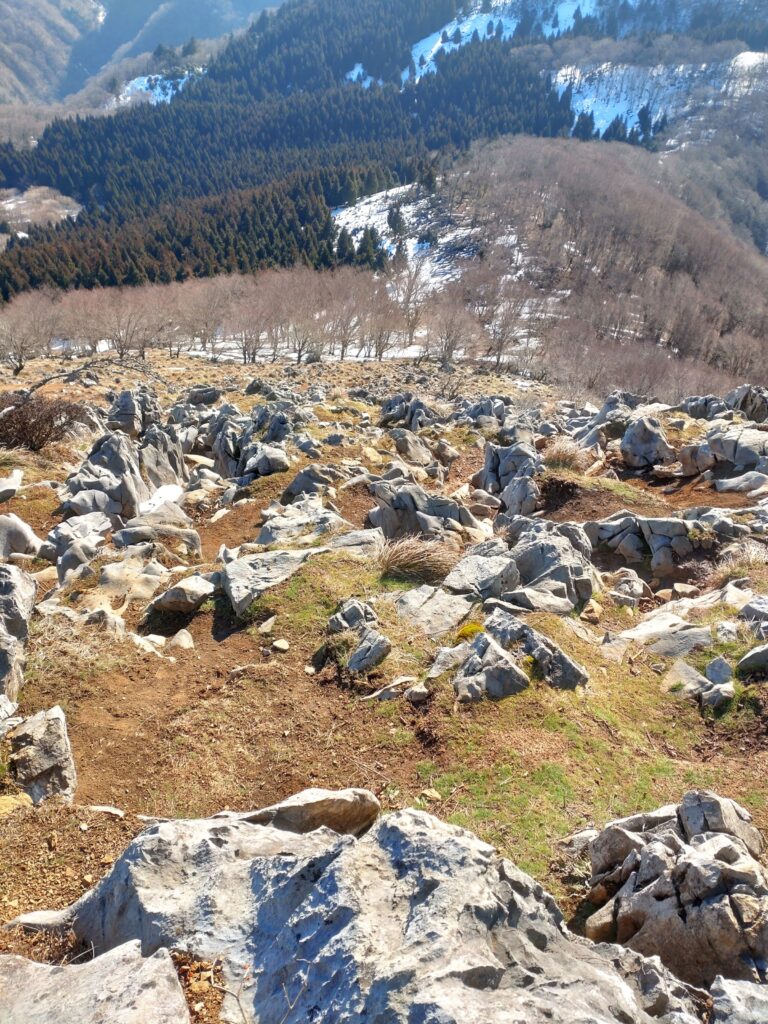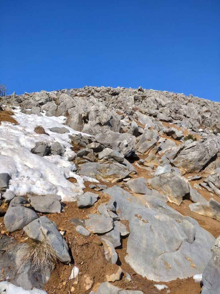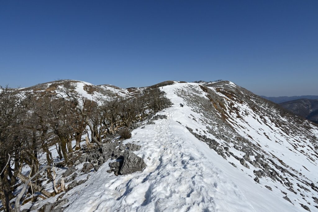この稜線が曲者で石灰岩柱に雪が付いているので、岩の近くを踏むと太もも近くまで雪を踏み抜いて、しかもそこには岩が…