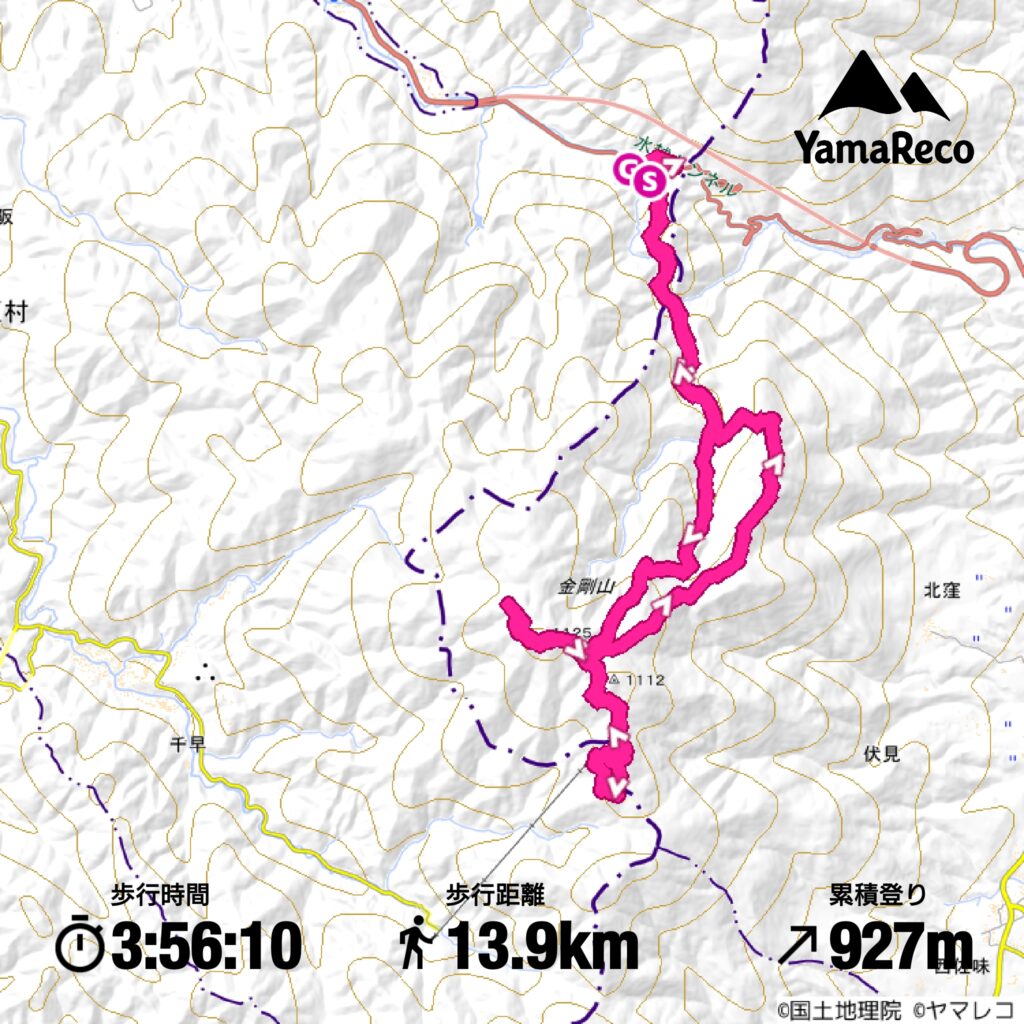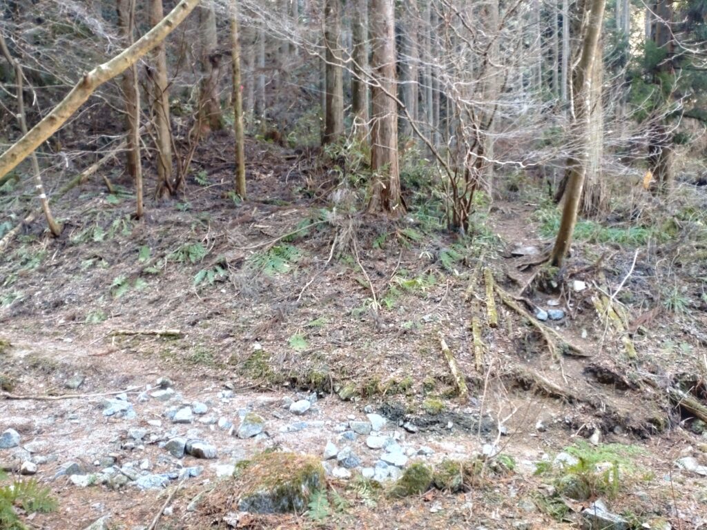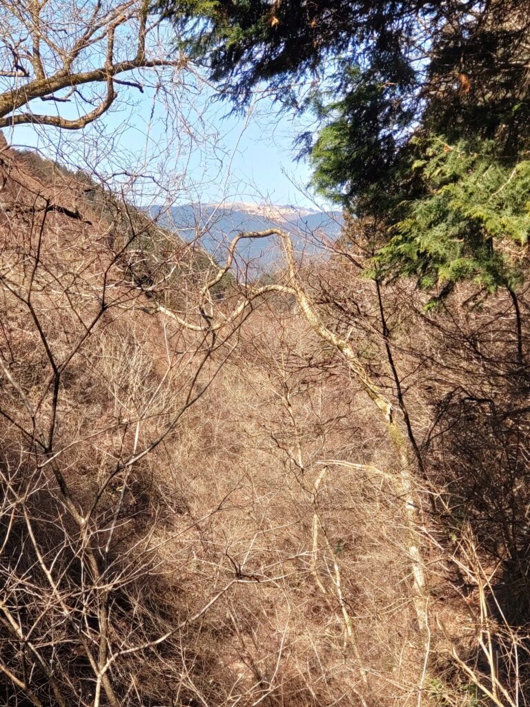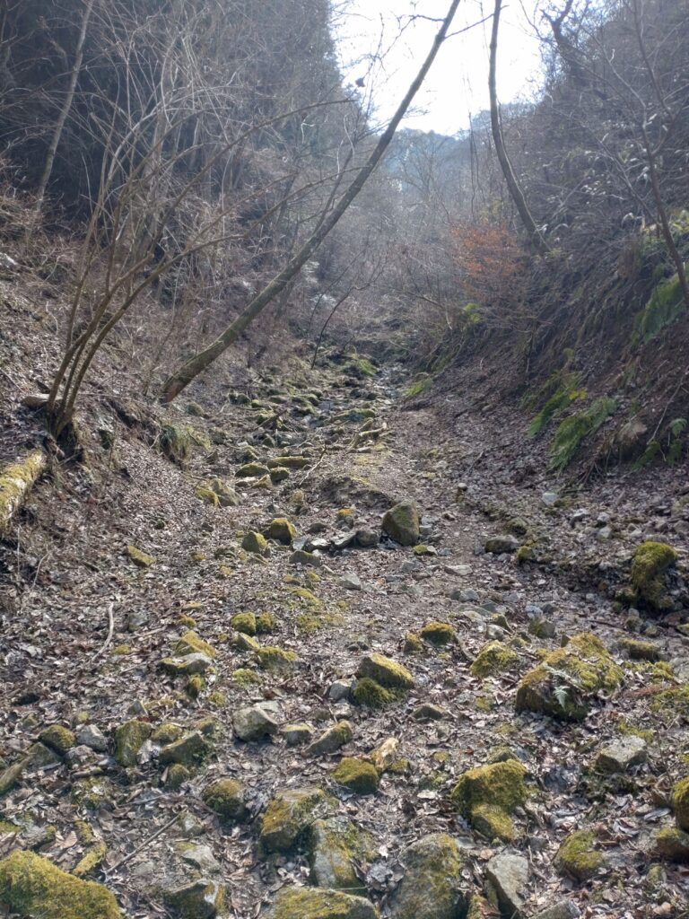 そして今回は登ったことが無いルートの「カヤンボ谷」を行ってみました。水越峠からダイトレを登るとガンドガコバ林道から水越川を渡って山道に入るところにカヤンボの四阿があるですが、そこがカヤンボ谷の入り口です。カヤンボって面白い名前だなと思うのですが、茅が生い茂っていたからこんな名前になったのかなと勝手に想像していました。時期的に真冬なので茅が生い茂っているという感じではありませんでしたが、枯れ谷であまり気持ちの良い道という感じではありませんでした。途中に大きな堰堤が立ちはだかっていて、堰堤の左に4連梯子が掛けられていました。右にも巻き道があったので私は右を行きましたが、どちらを行ってもここは少し危険だと思います。谷はその上で右ルートと左ルートに分岐していて、道はどちらを行ってもまた合流するようなので、今回は右ルートを行ってみました。谷を登り詰めるとサネ尾に合流して、山頂に至ります。