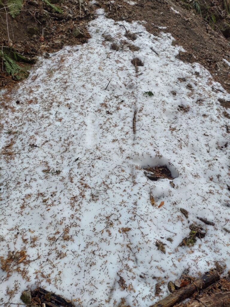 この日の山頂付近の日陰は積もった雪が溶けて再び凍ったアイスバーン状態になっていましたが、日当たりの良いところはドロドロの泥濘でとっても歩きにくかったです。アイスバーンは山頂付近の一部だけだったのでアイゼンを着けずにやり過ごしましたが、一回滑って転んでしまいました。やっぱり無精してはダメですね…