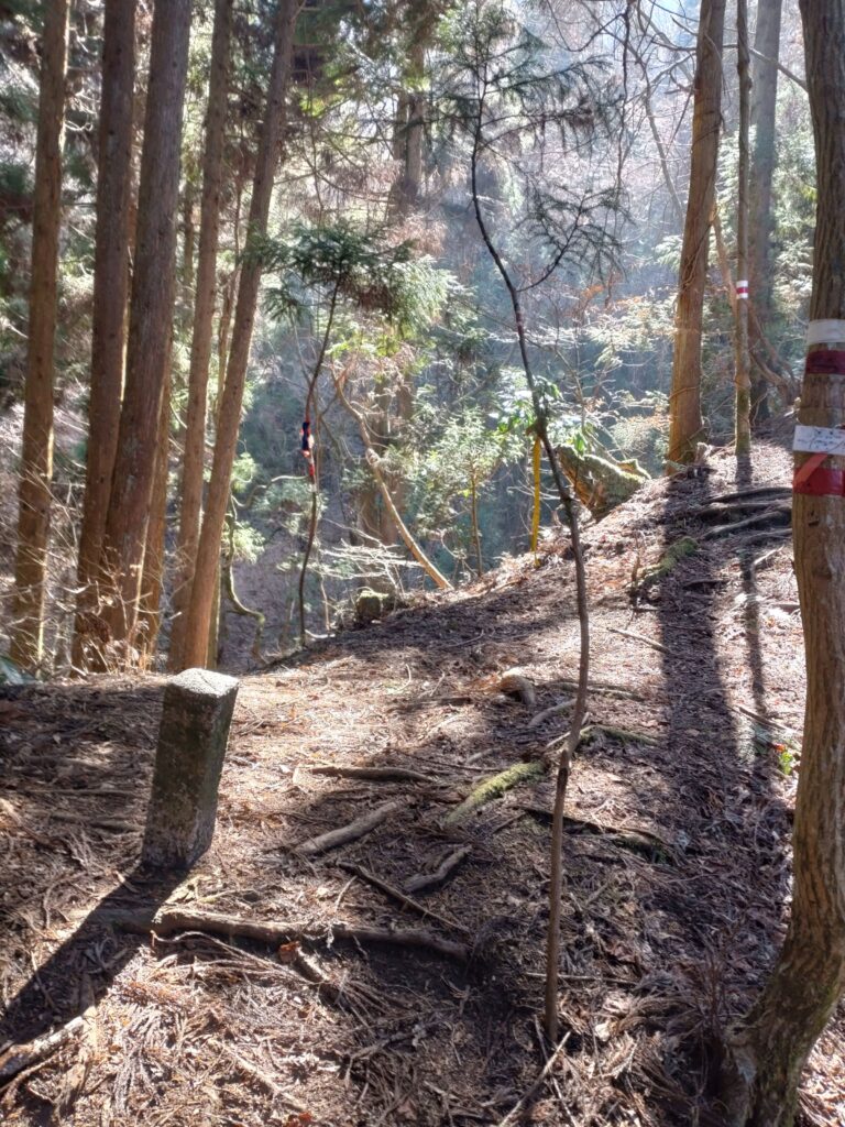 ガンドガコバ林道からカヤンボ谷への入り口(テープが二重に巻いてある木の付近)です。