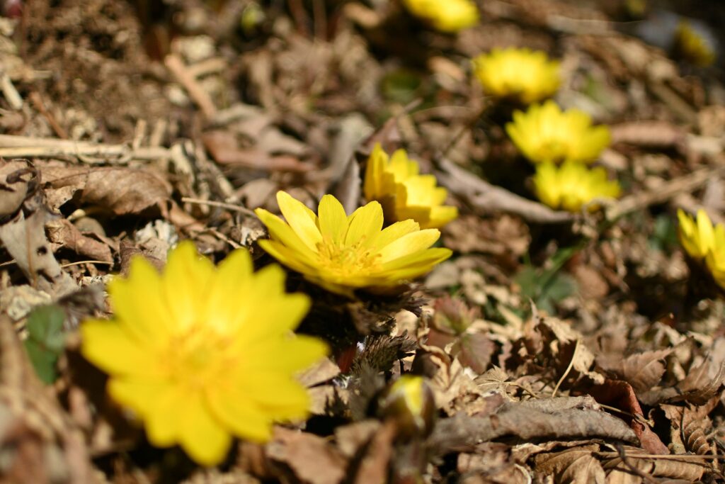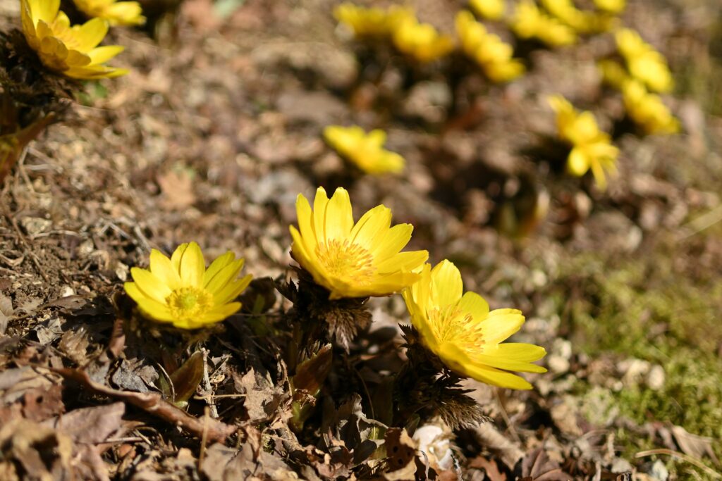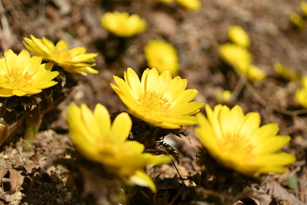 前回行った金剛山(その時の投稿はこちら)は雪と氷の世界でフクジュソウもほとんど蕾でしたが、そろそろ満開になっているのではないかと考えて見に行ってきました。結論から言うと、今がまさに見頃だと思います。この時期はまだ他に目ぼしいお花がないので、フクジュソウの所だけ黄色く輝いて見えました。この日は山頂付近お昼の気温は11℃もあり撮影していても寒くもなく快適な陽気でした。